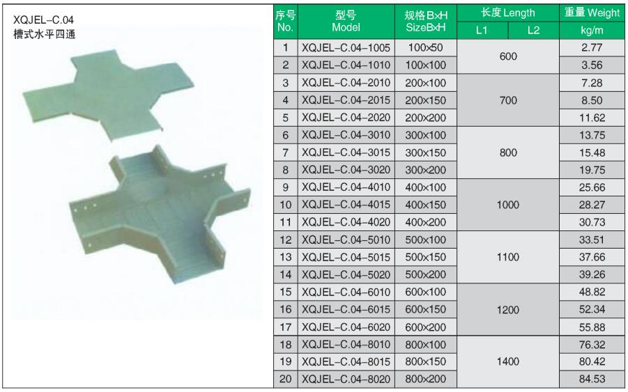 XQJEL_C.04槽式水平四通產(chǎn)品型號、規(guī)格、重量等參數(shù)及XQJEL_C槽式電纜橋架在不同跨距下允許均布載荷變形量。