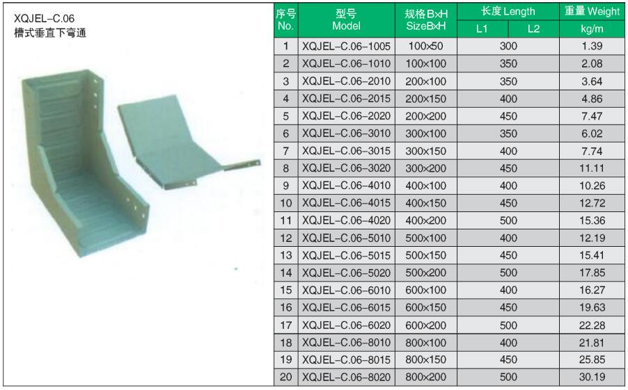 XQJEL_C.06槽式垂直下彎通產(chǎn)品型號(hào)、規(guī)格、重量等參數(shù)及XQJEL_C槽式電纜橋架在不同跨距下允許均布載荷變形量。