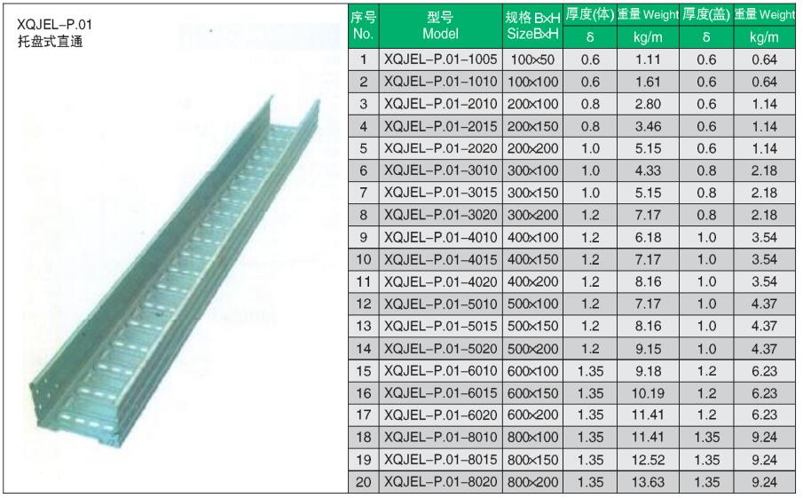 XQJEL_P.01托盤式直通產(chǎn)品型號(hào)、規(guī)格、重量等參數(shù)及XQJEL_P托盤式電纜橋架在不同跨距下允許均布載荷變形量。