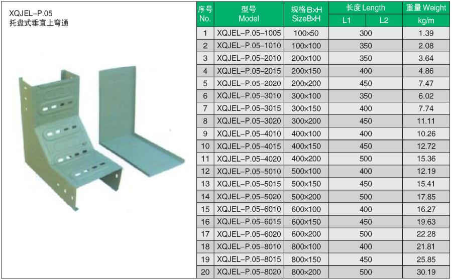 XQJEL_P.05托盤式上彎通產(chǎn)品型號、規(guī)格、重量等參數(shù)及XQJEL_P托盤式電纜橋架在不同跨距下允許均布載荷變形量。