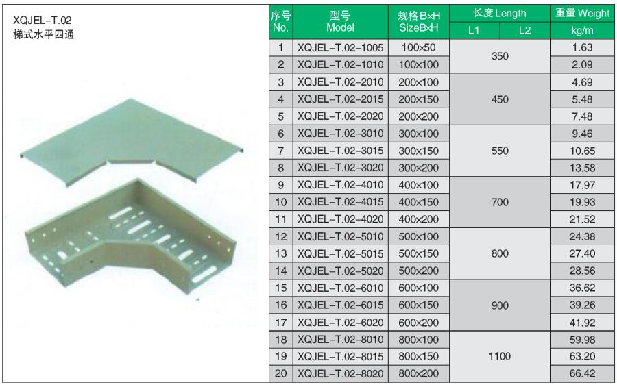 XQJEL_T.02梯式彎通產(chǎn)品型號(hào)、規(guī)格、重量等參數(shù)及XQJEL_T梯式電纜橋架在不同跨距下允許均布載荷變形量。