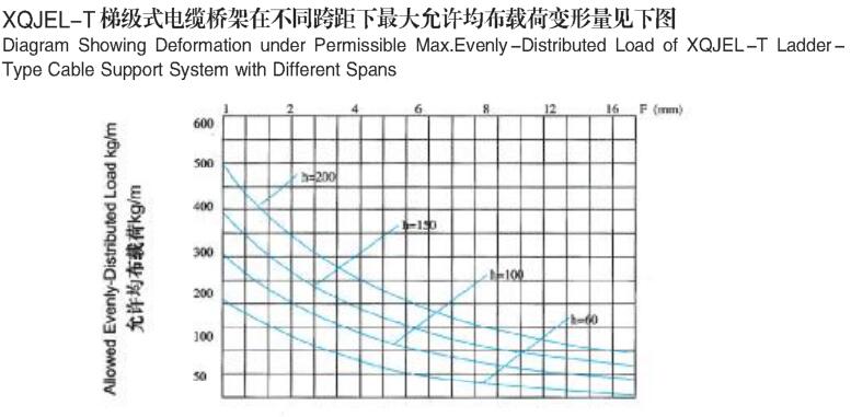XQJEL_T.04梯式四通產(chǎn)品型號、規(guī)格、重量等參數(shù)及XQJEL_T梯式電纜橋架在不同跨距下允許均布載荷變形量。