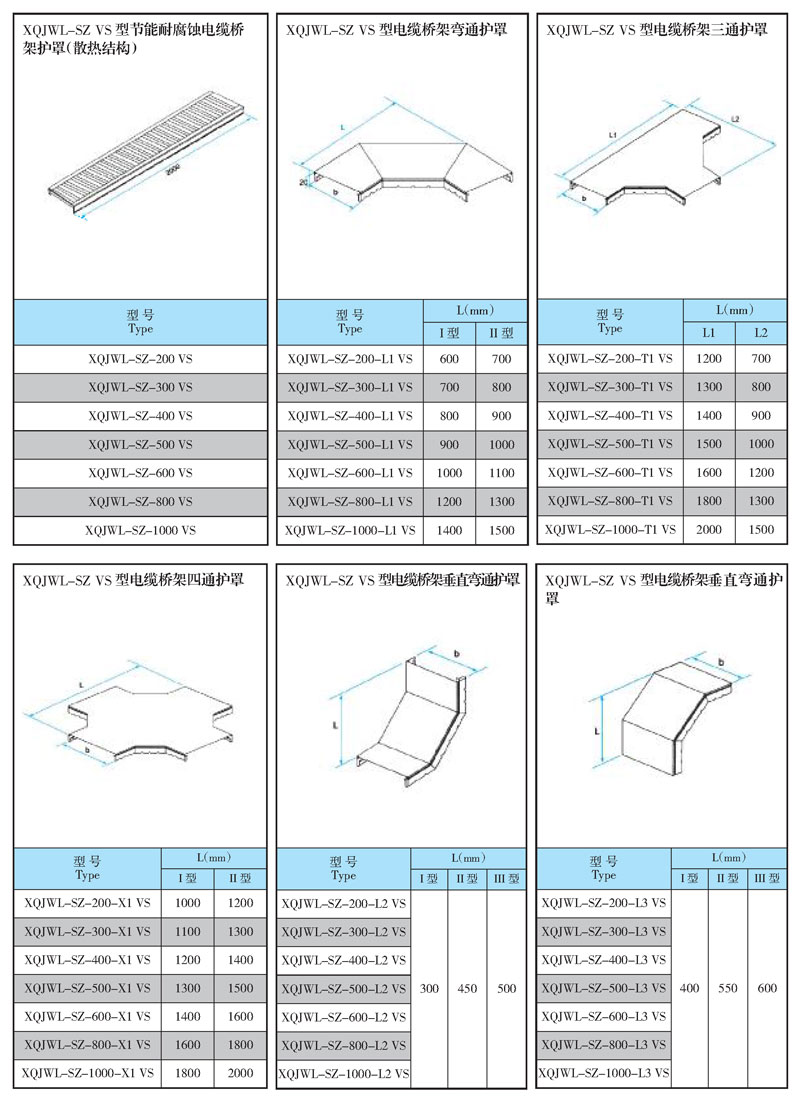 XQJWL-SZ VS 型節(jié)能耐腐蝕電纜橋架護罩(散熱結構)、 XQJWL-SZ VS 型電纜橋架彎通護罩、 XQJWL-SZ VS 型電纜橋架三通護罩、 XQJWL-SZ VS 型電纜橋架四通護罩、 XQJWL-SZ VS 型電纜橋架垂直上彎通護罩、 XQJWL-SZ VS 型電纜橋架垂直下彎通護罩各系列型號參數(shù):