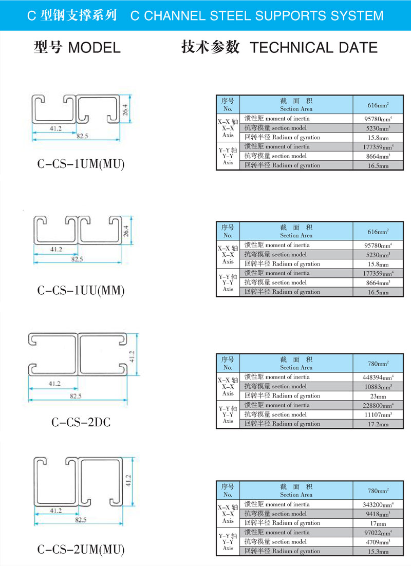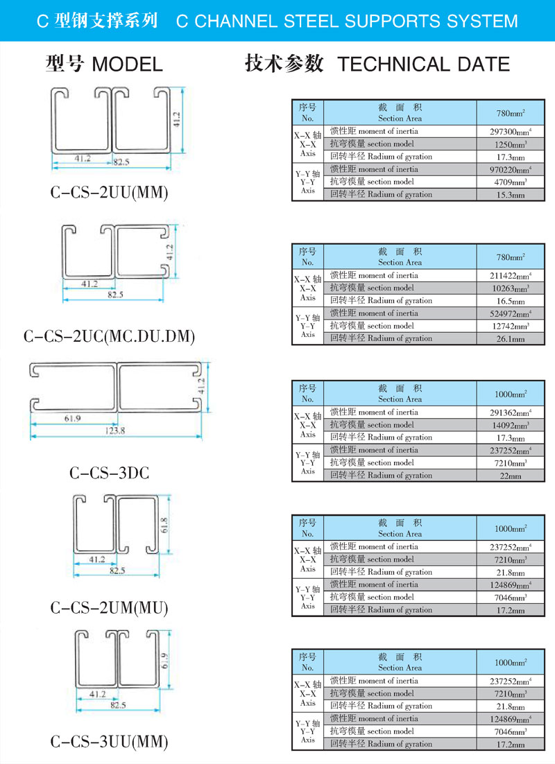 C型鋼支撐系列是我公司引進(jìn)國(guó)外先進(jìn)技術(shù)工藝,開(kāi)發(fā)的產(chǎn)品。也是目前國(guó)際上廣泛應(yīng)用的支撐件。具有結(jié)構(gòu)合理、安裝靈括、強(qiáng)度可靠等優(yōu)點(diǎn)?扇我庹{(diào)節(jié)支撐的高度及問(wèn)距。適合于電纜橋架、通風(fēng)管道等各種患掛、吊裝設(shè)備的安裝 。